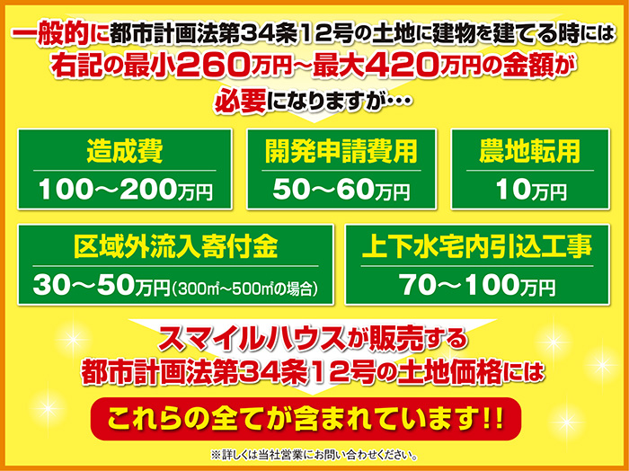| その他 | ・区域・区分/市街化調整区域※都市計画法第34条12号該当地 ※机上分筆により土地面積が増減する場合があります。 ・土地価格/895万円(1区画)〜995万円(1区画) |