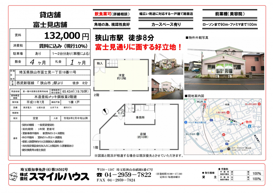 狭山市駅 徒歩8分 富士見通りに面する好立地! 幅広い用途に対応する一戸建店舗!